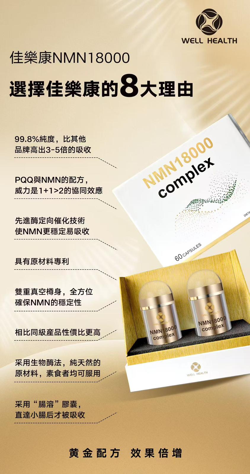 Well Health NMN 18000 Complex 產品規格: 60粒/盒 (買1送1) 商品介紹: Well Health佳樂康 NMN 18000 Complex 黃金配方